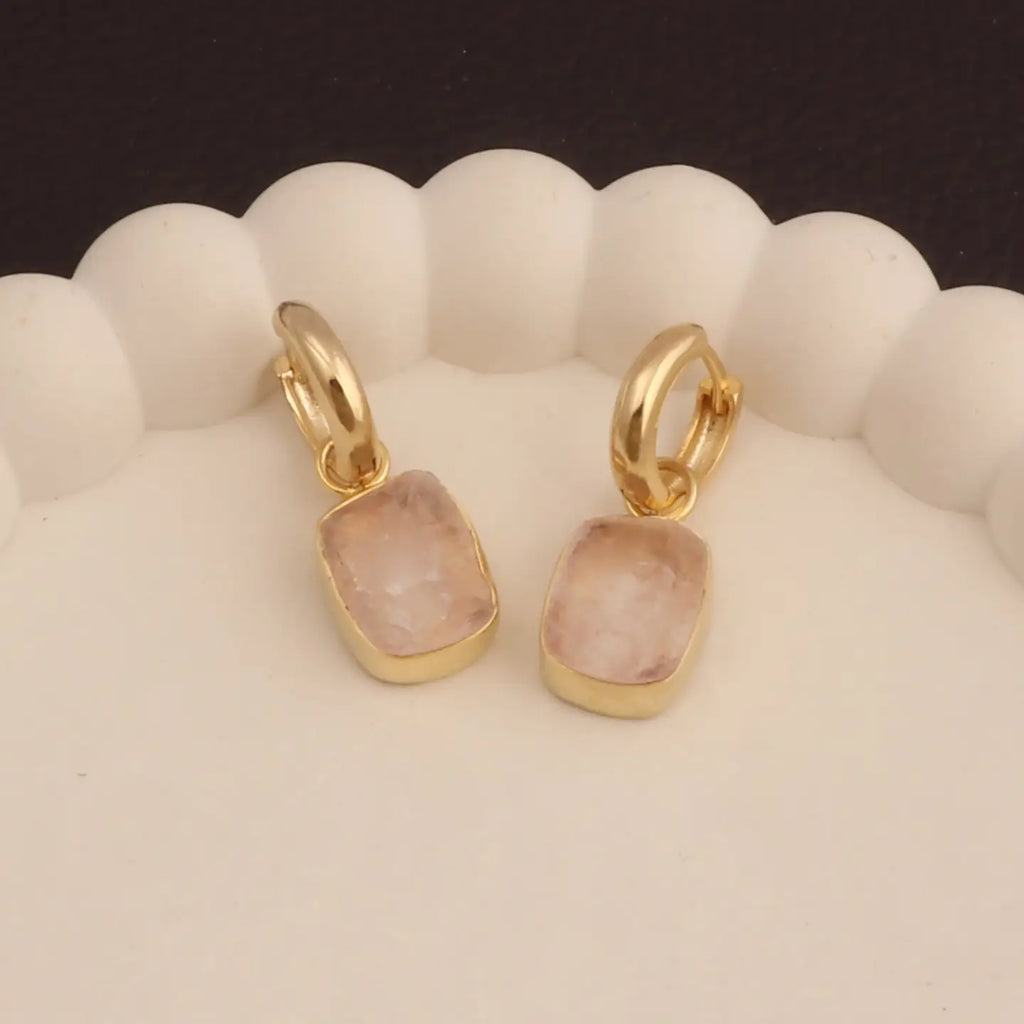 Elegant gold-plated hoops featuring natural rose quartz gemstones. Handcrafted with a raw, organic cut for a unique and timeless appeal. Perfect for everyday wear or adding a subtle sparkle to special occasions