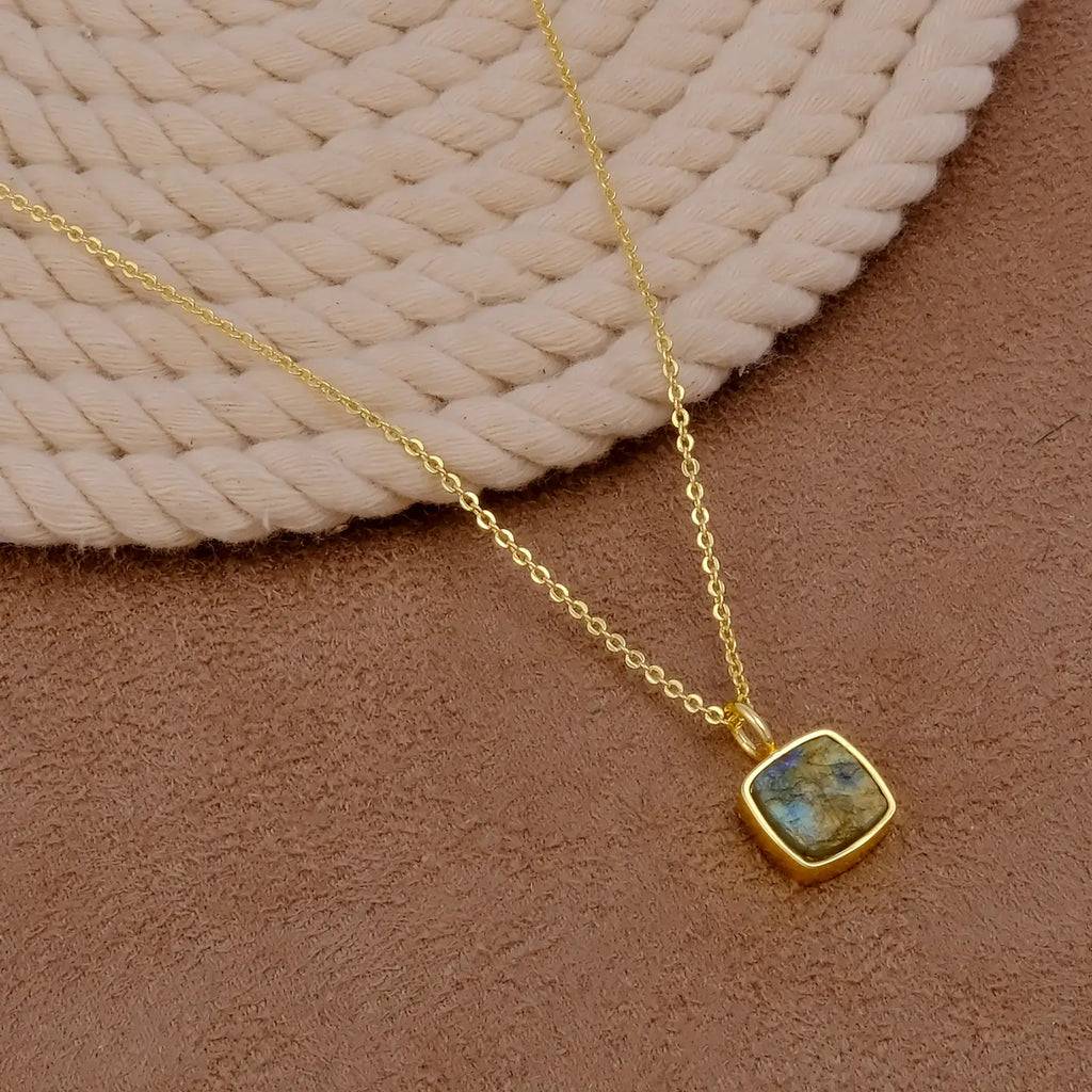 Elevate your everyday style with this Gold Plated Labradorite Necklace, featuring a stunning square-cut gemstone that reflects captivating flashes of blue and green. Each labradorite is handpicked for its natural shimmer and mystical glow, known for enhancing intuition and creativity. The sleek square bezel design adds a modern touch, making this piece perfect for both layering and solo wear. A versatile and timeless accessory that brings an earthy elegance to any outfit.